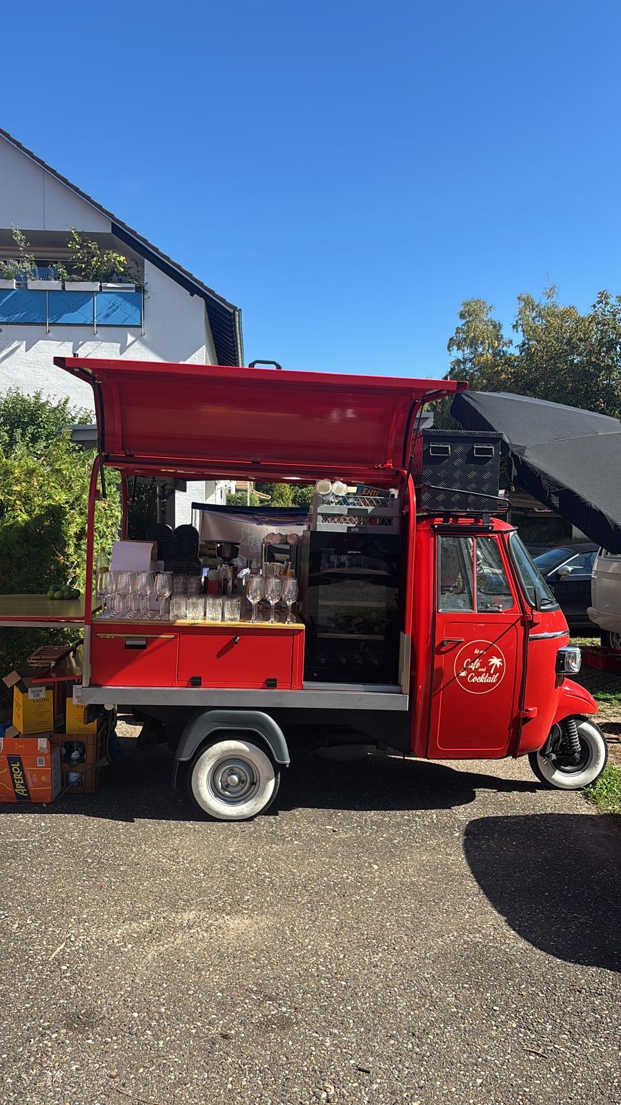 Unsere liebevoll umgebaute Ape bringt den perfekten Mix aus italienischem Charme, Bar-Feeling und mobilem Genuss direkt zu dir! Ob aromatischer Espresso am Morgen, cremiger Cappuccino am Nachmittag oder prickelnde Cocktails am Abend – wir verwandeln jeden Ort in eine kleine Wohlfühloase.
